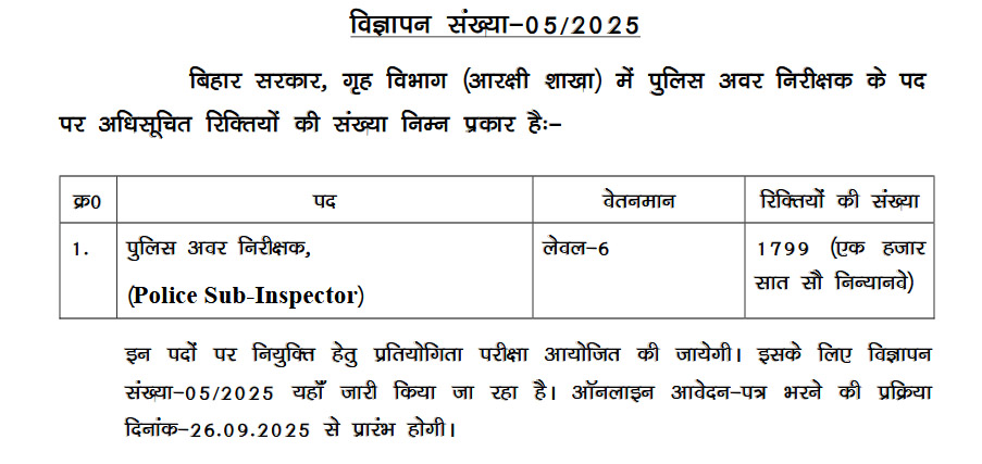 BPSSC Bihar SI From Recruitment 2025 : Vacancy Details Total : 1799 Post